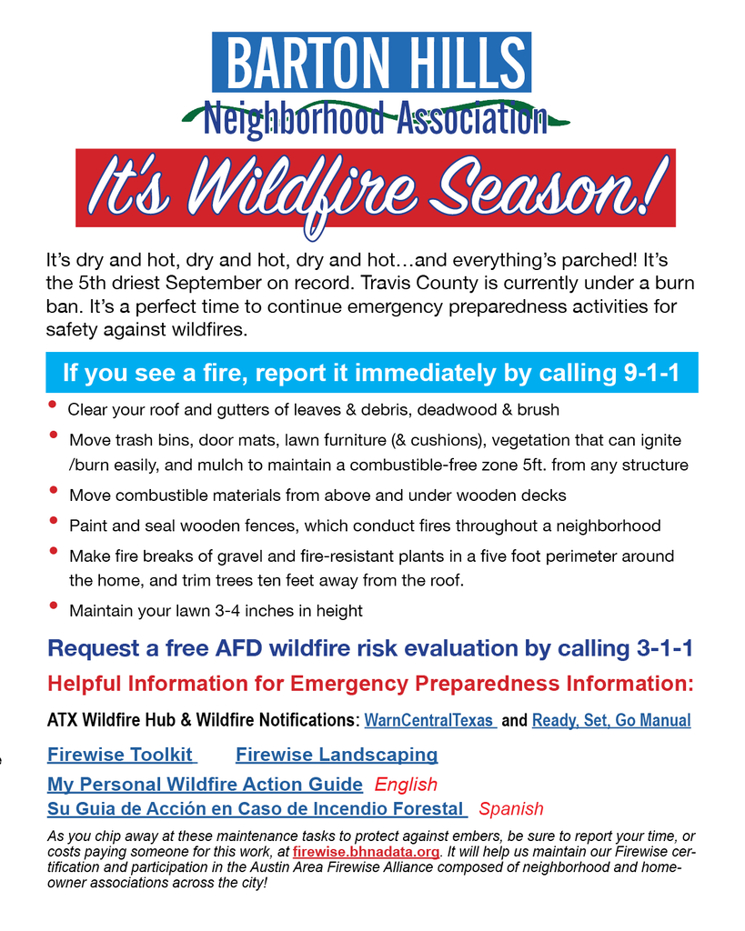 Wildfire may be the most serious but is not the only community-wide risk to the Barton Hills neighborhood. Another risk, also increased by climate change, is electrical power outage. As anyone who was in Texas during winter storm Uri in February 2021 remembers, a wide-spread outage can leave us shivering (or sweating) in our dark houses without heat, air conditioning, electronics, or water for days or weeks.